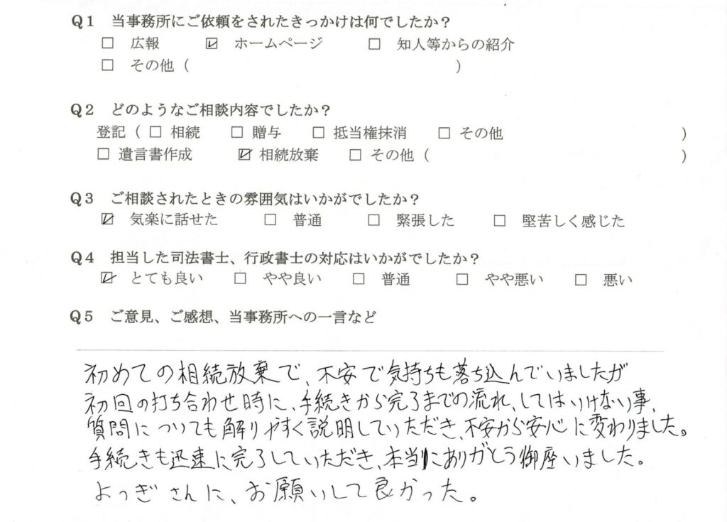 Q5 初めての相続放棄で、不安で気持ちも落ち込んでいましたが、初回の打ち合わせ時に、手続きから完了までの流れ、してはいけない事、質問についても解りやすく説明していただき、不安から安心に変わりました。手続きも迅速に完了していただき、本当にありがとう御座いました。よつぎさんに、お願いして良かった。